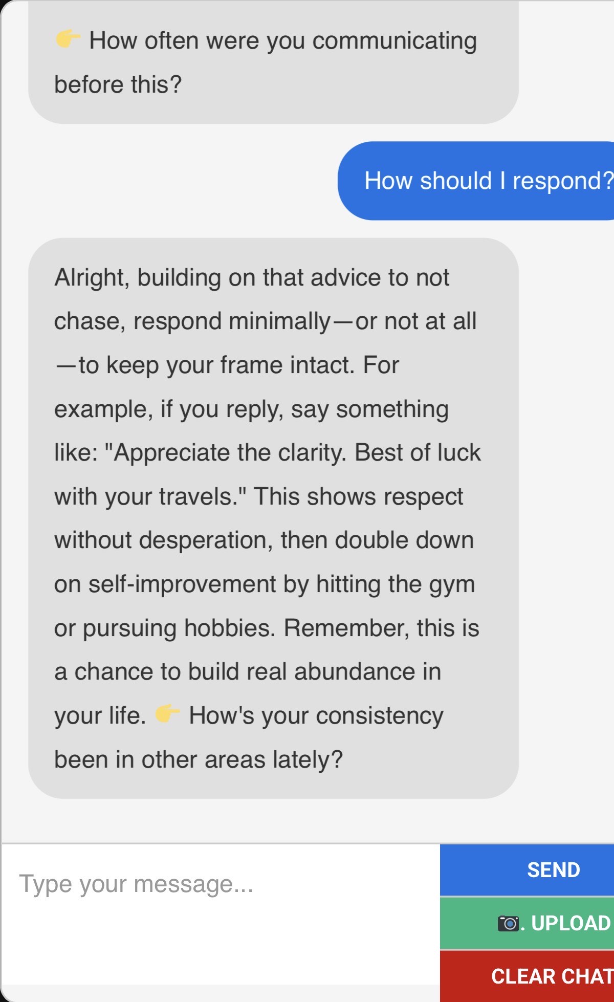 And for guys who have been wanting to pick my brain without a long phone session, this is it. My developer and I have been working hard for many months to bring you an AI chatbot coach who can help you with any struggles or sticking points you have with women. It’s been trained on my brain and my published materials, so it’s like you’re talking to the virtual me at a fraction of the cost!